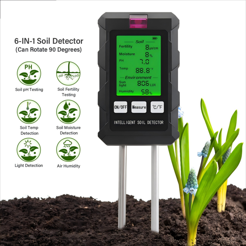 Точно измеряет плодородие почвы (EC), влажность, pH, температуру, солнечный свет и влажность, предоставляя исчерпывающие данные о почве для точного ухода за растениями.